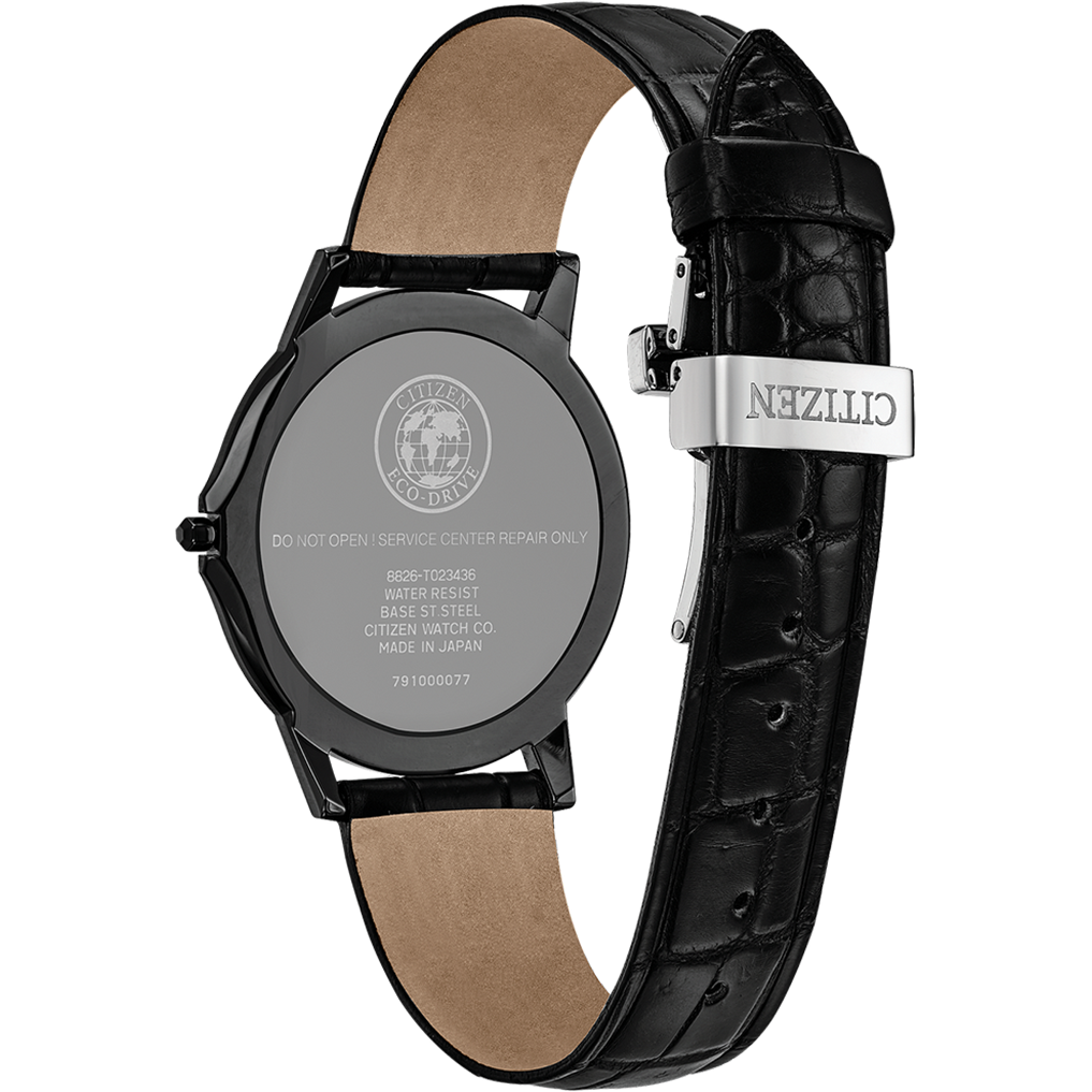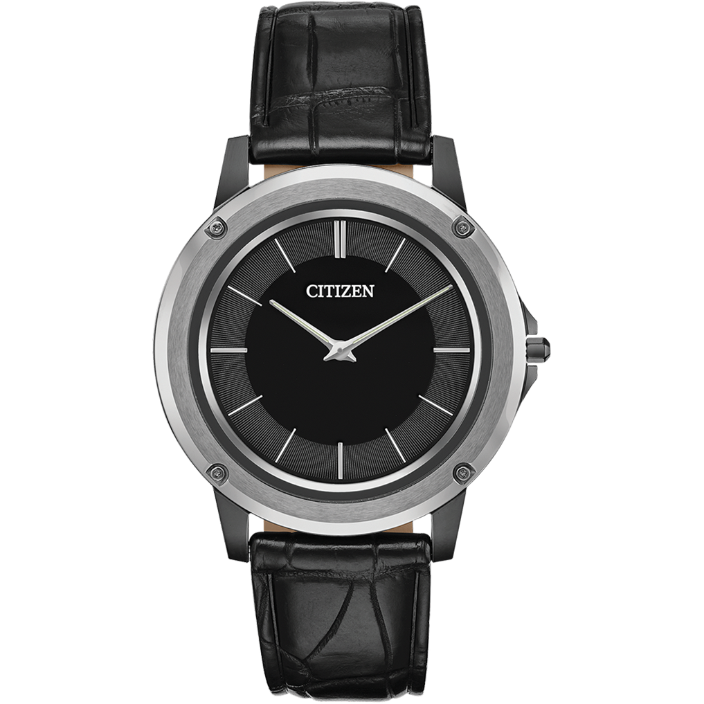 The line between design and technology just got smaller. The CITIZEN Eco-Drive One, incredibly thin and the first of its kind, is the world's thinnest light powered watch at just 2.98mm*. The well thought out design of this timepiece is reflected in the detail of the watch components, with 85 components in a movement 1.00mm thick. The model features a stainless steel case, black crocodile strap with deployment clasp and black sapphire crystal dial. Featuring our Eco-Drive technology – powered by light, any light. Never needs a battery.
