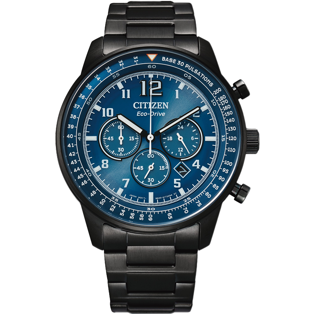 An extension of the Chronograph range, this multigenerational chronograph is your perfect accessible pilot timepiece. Featuring an array of aviation level functionality such as Eco-Drive technology ensuring your watch never loses power, a thin bezel with a wide dial for better visibility and luminous markings. Armed with base 30 pulsations for high accuracy heart rate count. This method is one which is used medically to measure heart rates both quickly and accurately. Start counting the heart rate for 30 beats from the 12 hour marker. When you reach 30, where the second hand points is the heart rate. Secondary functions include date, 12/24 hour time, water resistance to WR100/10 Bar, ideal for swimming and snorkelling. This model has definite classic appeal with a dress edge found in the stainless steel bracelet style band and metallic blue dial and black stainless steel case and bezel, topped with a mineral crystal glass. Case size, 44mm. Calibre B620.