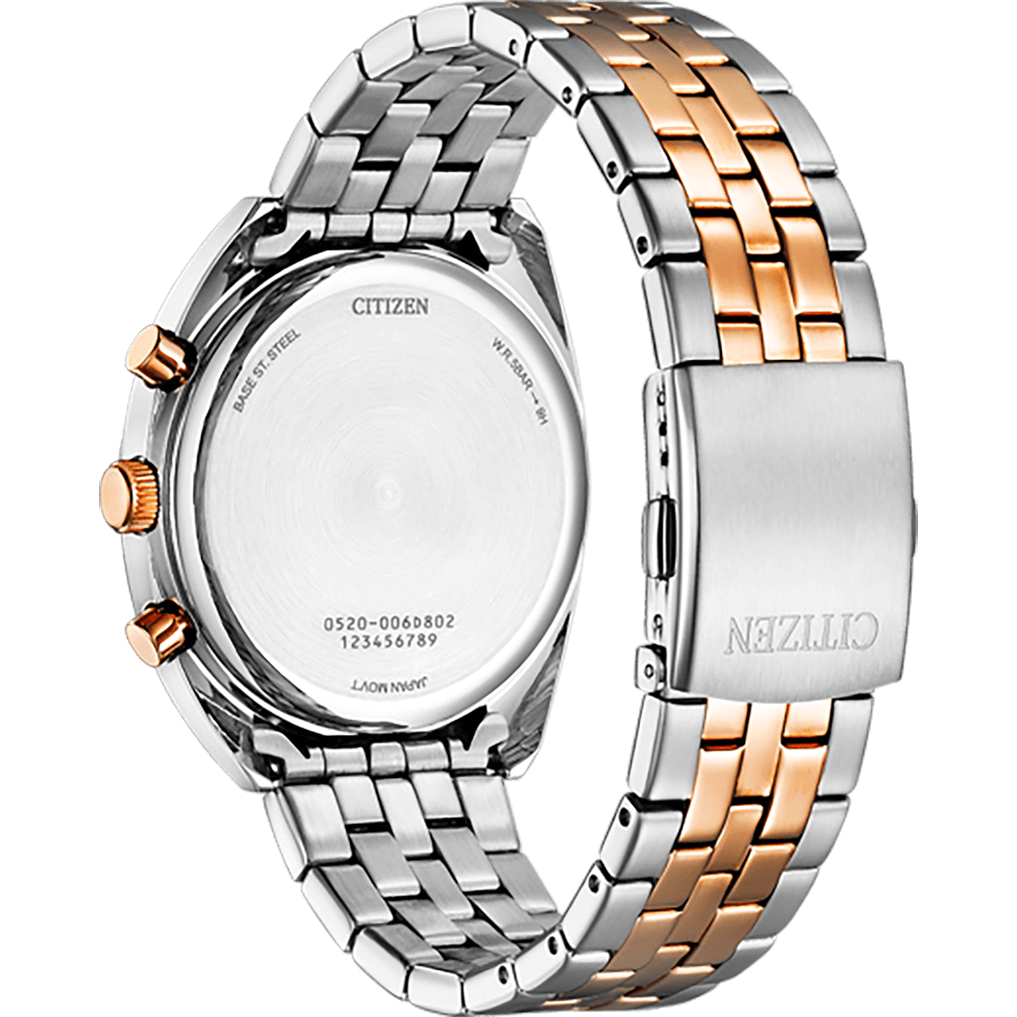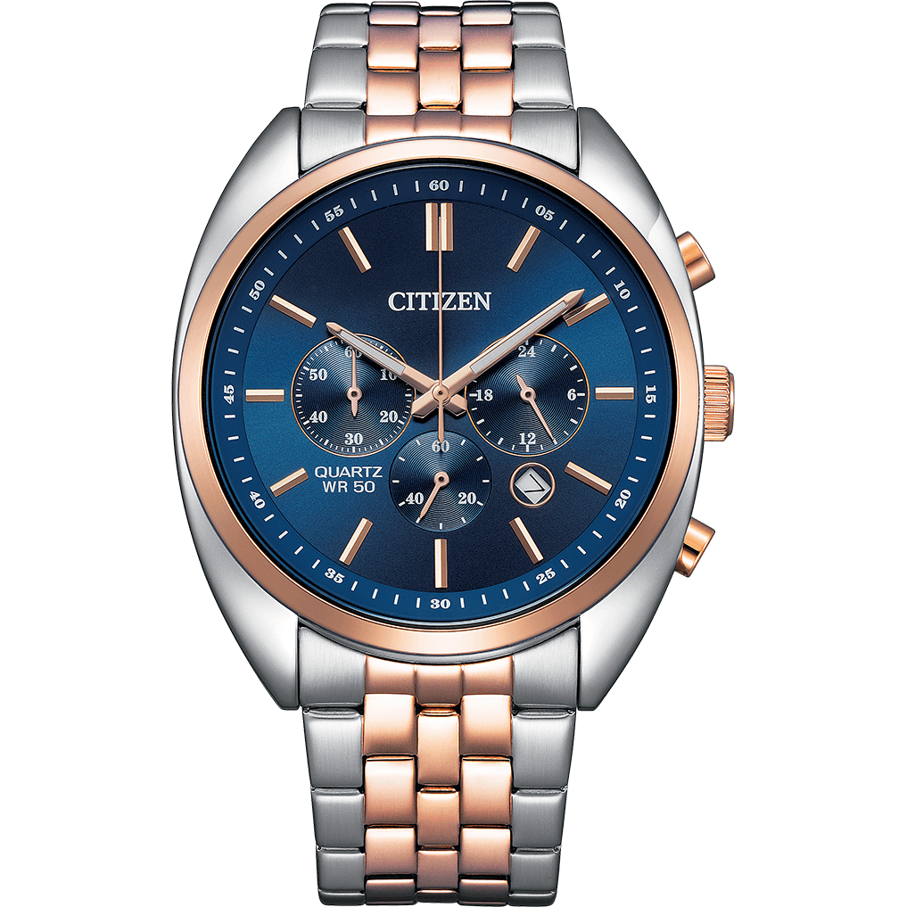 The Citizen Quartz men's Sports Chronograph comes with 1/1 second units chronograph 60 minute timing, 24 hrs display and date display. Featuring stainless steel case and bracelet with a dark blue dial styling, the watch is an attention grabber. The watch is powered by CITIZEN's high precision Japanese Quartz movement.