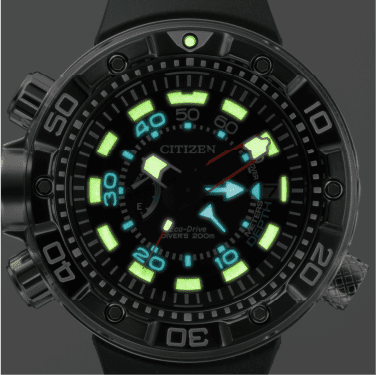 Visibility declines as soon as you get into the water. The sea is often darker than it looks and moving currents can confuse the eye further. At CITIZEN, we design our watches for maximum readability even in dim light. The lume we apply to the hands and indexes stores energy and glows in the dark. We make sure that both the time and the elapsed diving time are visible and legible. In addition, the lume we use is neither toxic nor radioactive; it's friendly to both people and the environment.